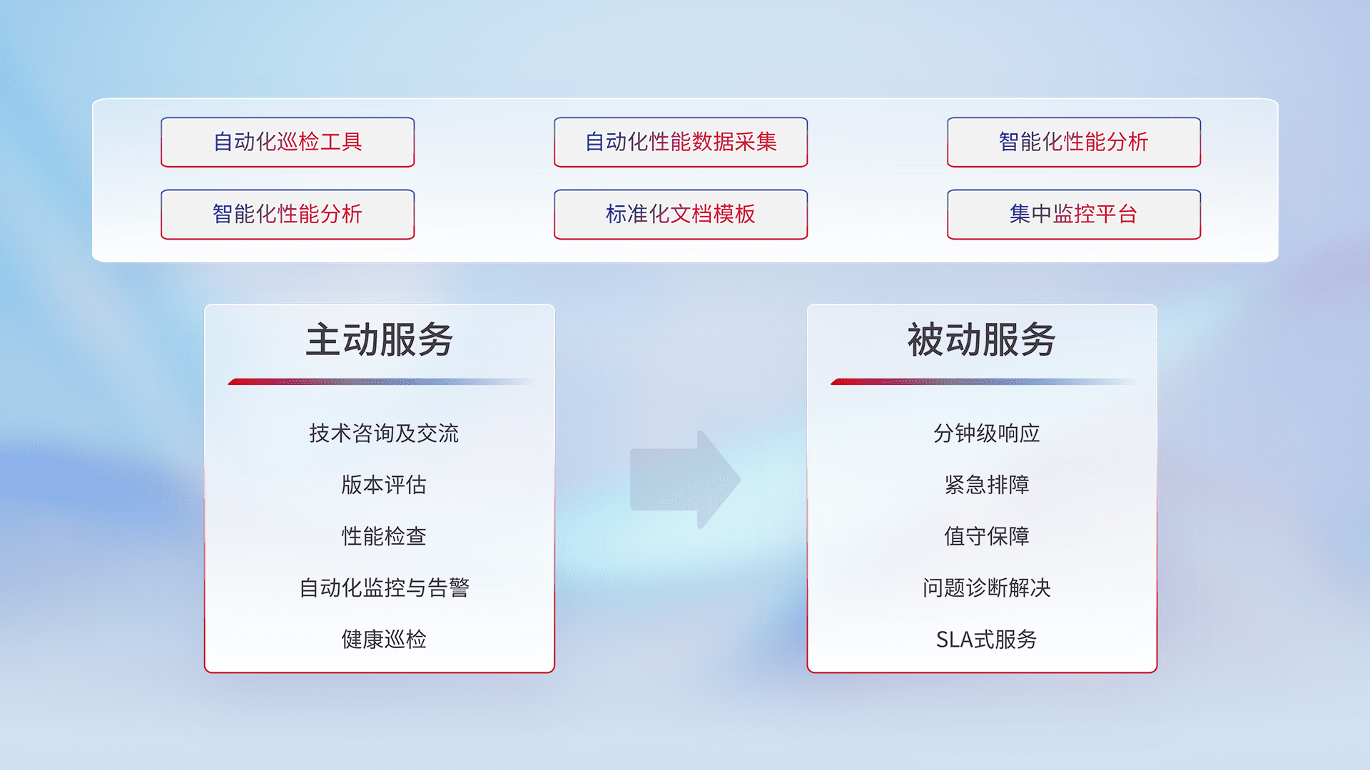 智能化工具和标准化文档,,保障服务质量,,,提供主动服务(包含技术咨询、、版本评估、、、、性能检查、、、自动化监控与告警、、、健康巡检)和被动服务包含(分钟级响应、、紧急排障、、、值守保障、、问题诊断解决、、、、SLA服务)。。。。